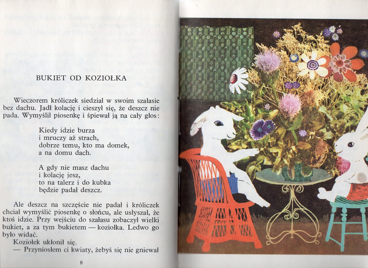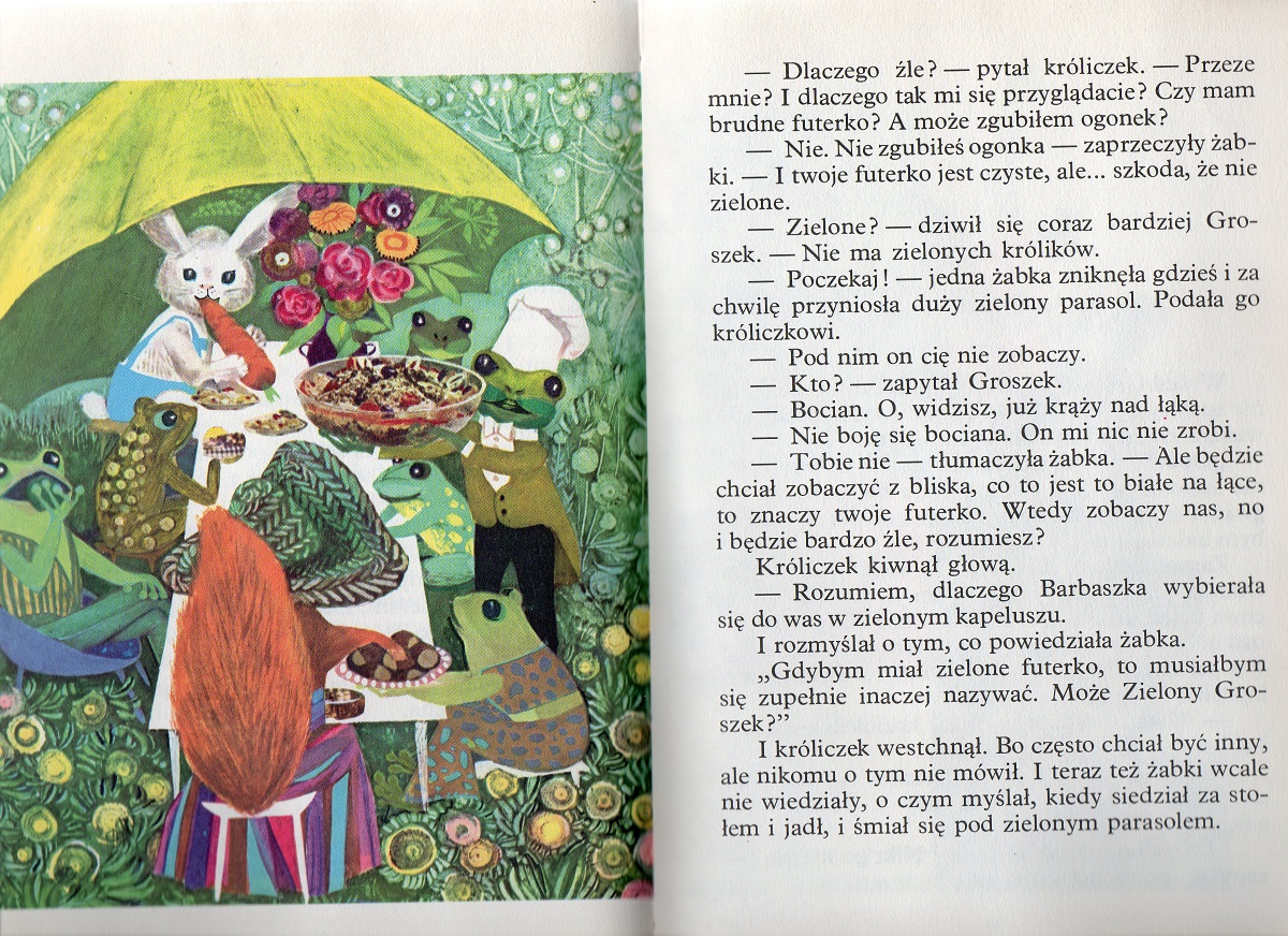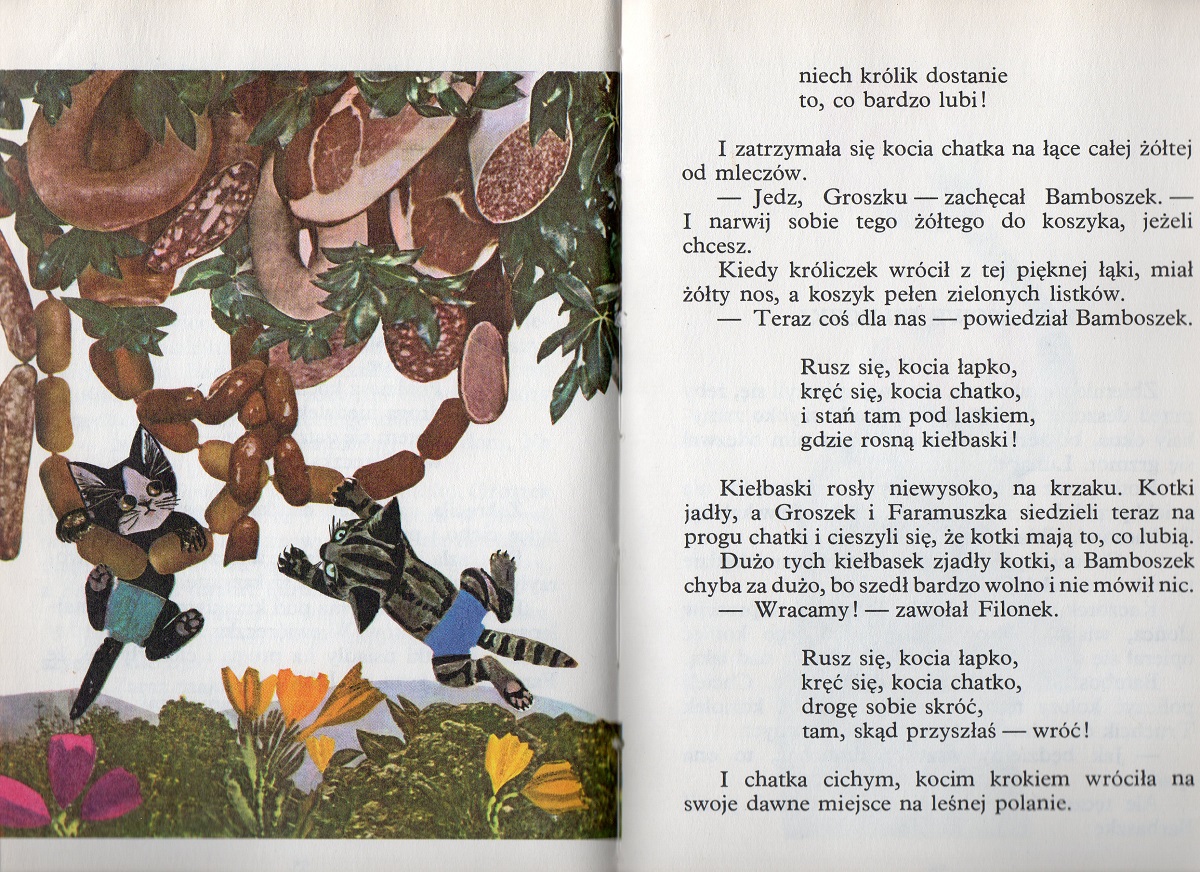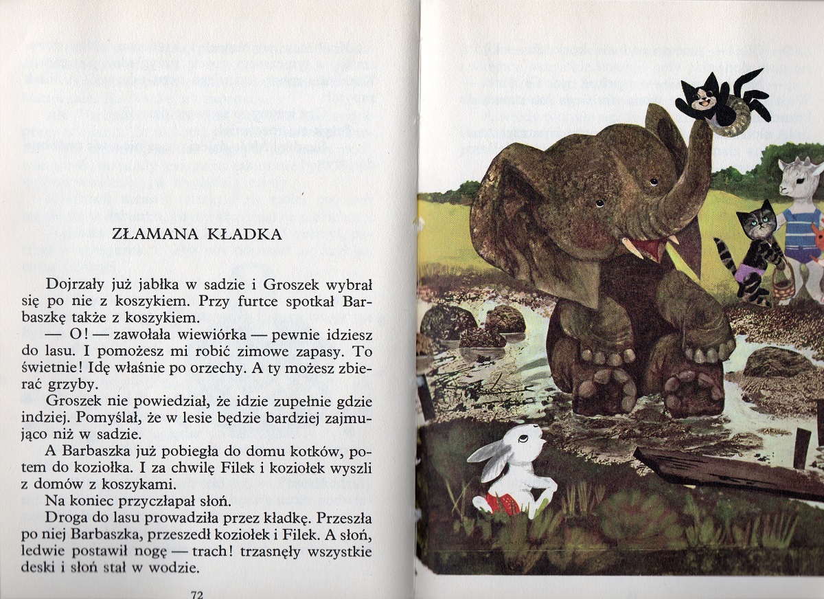 Przygody białego króliczka Groszka i jego przyjaciół – dwóch kotków: Filka i Bamboszka, wiewiórki Barbaszki i jej dzieci, koziołka Truchcika, słonia i paru innych. Groszek zamieszkał w szałasie, niestety – co i rusz ktoś mu zjada dach…