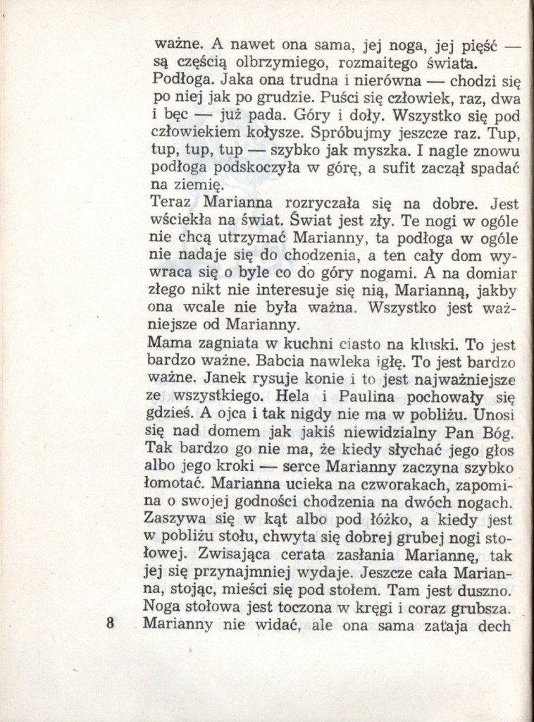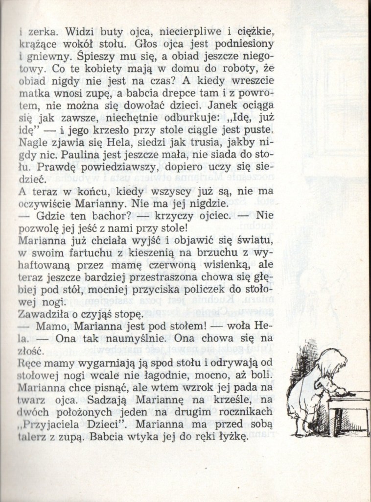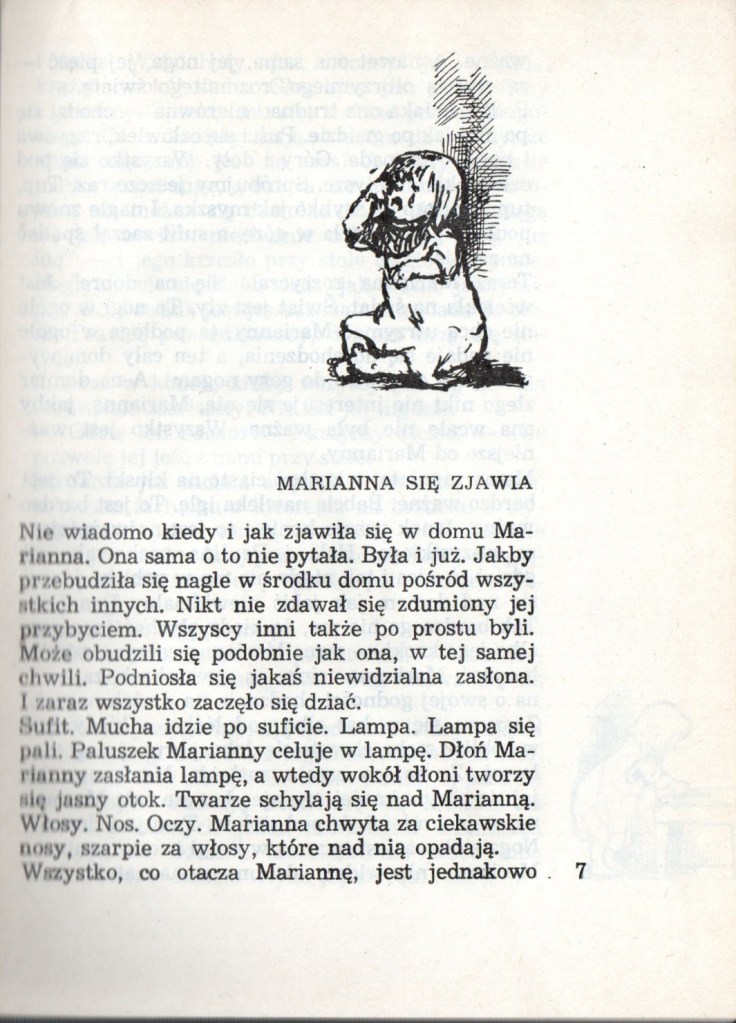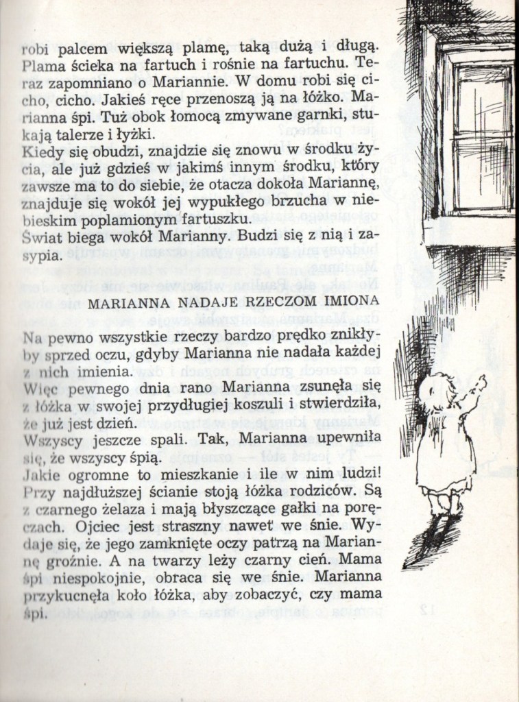 Świat widziany oczami małego dziecka. Lata dwudzieste i trzydzieste XX wieku. Marianna opisuje wszystko co widzi dookoła siebie, najpierw najbliższe otoczenie – mieszkanie, ulicę, potem przedszkole i szkołę. Życie dziecka nie jest tak beztroskie, jak wydaje się z perspektywy dorosłych. Marianna przeżywa małe i większe smutki, jak zgubienie porcelanowej świnki należącej do babci albo stłuczenie jej ulubionego kubka.